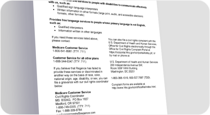 NONDISCRIMINATION NOTICE Regence complies with applicable Federal civil rights laws and does not discriminate on the basis of race, color, national origin, age, disability, or sex. Regence does not exclude people or treat them differently because of race, color, national origin, age, disability, or sex. Regence: Provides free aids and services to people with disabilities to communicate effectively with us, such as: Qualified sign language interpreters Written information in other formats (large print, audio, and accessible electronic formats, other formats) Provides free language services to people whose primary language is not English, such as: Qualified interpreters Information written in other languages If you need these services listed above, You can also file a civil rights complaint with the please contact: U.S. Department of Health and Human Services, Office for Civil Rights electronically through the Medicare Customer Service Office for Civil Rights Complaint Portal at 1-800-541-8981 (TTY: 711) https://ocrportal.hhs.gov/ocr/portal/lobby.jsf, or by mail or phone at: Customer Service for all other plans 1-888-344-6347 (TTY: 711) U.S. Department of Health and Human Services 200 Independence Avenue SW, If you believe that Regence has failed to Room 509F HHH Building provide these services or discriminated in Washington, DC 20201 another way on the basis of race, color, national origin, age, disability, or sex, you can 1-800-368-1019, 800-537-7697 (TDD). file a grievance with our civil rights coordinator below: Complaint forms are available at http://www.hhs.gov/ocr/office/file/index.html. Medicare Customer Service Civil Rights Coordinator MS: B32AG, PO Box 1827 Medford, OR 97501 1-866-749-0355, (TTY: 711) Fax: 1-888-309-8784 [email protected] Customer Service for all other plans Civil Rights Coordinator MS CS B32B, P.O. Box 1271 Portland, OR 97207-1271 1-888-344-6347, (TTY: 711) [email protected] 01012017.04PF12LNoticeNDMARegence