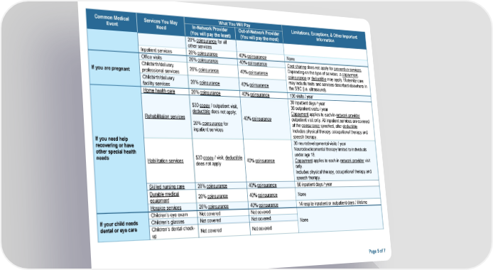 Common Medical Services You May What You Will Pay Limitations, Exceptions, & Other Important Event Need In-Network Provider Out-of-Network Provider Information (You will pay the least) (You will pay the most) 20% coinsurance for all other services Inpatient services 20% coinsurance 40% coinsurance None Office visits 20% coinsurance 40% coinsurance Cost sharing does not apply for preventive services. Childbirth/delivery 20% coinsurance 40% coinsurance Depending on the type of services, a copayment, If you are pregnant professional services coinsurance or deductible may apply. Maternity care Childbirth/delivery 20% coinsurance 40% coinsurance may include tests and services described elsewhere in facility services the SBC (i.e. ultrasound). Home health care 20% coinsurance 40% coinsurance 130 visits / year 30 inpatient days / year $30 copay / outpatient visit, 30 outpatient visits / year deductible does not apply; Copayment applies to each in-network provider Rehabilitation services 40% coinsurance outpatient visit only. All inpatient services are covered 20% coinsurance for at the coinsurance specified, after deductible. inpatient services Includes physical therapy, occupational therapy and If you need help speech therapy. recovering or have 30 neurodevelopmental visits / year other special health Neurodevelopmental therapy limited to individuals needs $30 copay / visit, deductible under age 18. Habilitation services does not apply 40% coinsurance Copayment applies to each in-network provider visit only. Includes physical therapy, occupational therapy and speech therapy. Skilled nursing care 20% coinsurance 40% coinsurance 60 inpatient days / year Durable medical 20% coinsurance 40% coinsurance None equipment Hospice services 20% coinsurance 40% coinsurance 14 respite inpatient or outpatient days / lifetime Children's eye exam Not covered Not covered If your child needs Children's glasses Not covered Not covered None dental or eye care Children's dental check- Not covered Not covered up Page 5 of 7