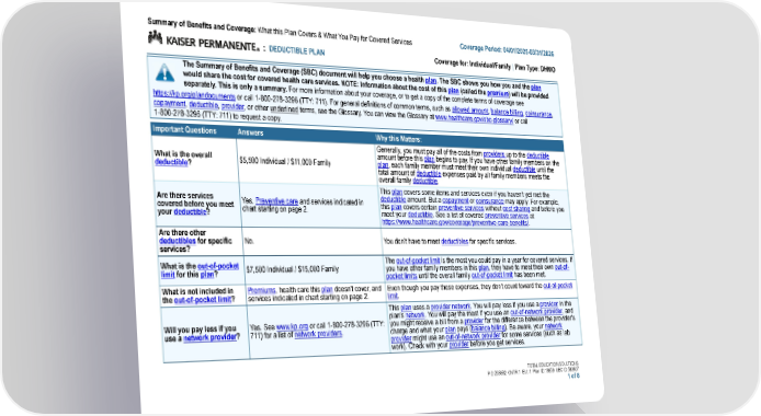 Summary of Benefits and Coverage: What this Plan Covers & What You Pay for Covered Services Coverage Period: 04/01/2025-03/31/2026 DEDUCTIBLE PLAN Coverage for: Individual/Family | Plan Type: DHMO : The Summary of Benefits and Coverage (SBC) document will help you choose a health plan. The SBC shows you how you and the plan would share the cost for covered health care services. NOTE: Information about the cost of this plan (called the premium) will be provided separately. This is only a summary. For more information about your coverage, or to get a copy of the complete terms of coverage see https://kp.org/plandocuments or call 1-800-278-3296 (TTY: 711). For general definitions of common terms, such as allowed amount, balance billing, coinsurance, copayment, deductible, provider, or other underlined terms, see the Glossary. You can view the Glossary at www.healthcare.gov/sbc-glossary/ or call 1-800-278-3296 (TTY: 711) to request a copy. Important Questions Answers Why this Matters: Generally, you must pay all of the costs from providers up to the deductible amount before this plan begins to pay. If you have other family members on the What is the overall $5,500 Individual / $11,000 Family plan, each family member must meet their own individual deductible until the deductible? total amount of deductible expenses paid by all family members meets the overall family deductible. This plan covers some items and services even if you haven’t yet met the Are there services deductible amount. But a copayment or coinsurance may apply. For example, Yes. Preventive care and services indicated in covered before you meet this plan covers certain preventive services without cost sharing and before you chart starting on page 2. your deductible? meet your deductible. See a list of covered preventive services at https://www.healthcare.gov/coverage/preventive-care-benefits/. Are there other deductibles for specific No. You don’t have to meet deductibles for specific services. services? The out-of-pocket limit is the most you could pay in a year for covered services. If What is the out-of-pocket $7,500 Individual / $15,000 Family you have other family members in this plan, they have to meet their own out-of- limit for this plan? pocket limits until the overall family out-of-pocket limit has been met. What is not included in Premiums, health care this plan doesn't cover, and Even though you pay these expenses, they don't count toward the out-of-pocket the out-of-pocket limit? services indicated in chart starting on page 2. limit. This plan uses a provider network. You will pay less if you use a provider in the plan’s network. You will pay the most if you use an out-of-network provider, and Will you pay less if you Yes. See www.kp.org or call 1-800-278-3296 (TTY: you might receive a bill from a provider for the difference between the provider’s use a network provider? 711) for a list of network providers. charge and what your plan pays (balance billing). Be aware, your network provider might use an out-of-network provider for some services (such as lab work). Check with your provider before you get services. TOTAL EDUCATION SOLUTIONS PID:233882 CNTR:1 EU:-1 Plan ID:13859 SBC ID:583807 1 of 8