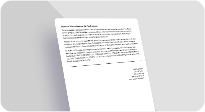 2025_SOB_Dental Advantage_LG 2025_Large Group_Premium IH Important Information about this Plan Document The services above are not all-inclusive – they include only the most common dental procedures in a class or service grouping. UPMC Health Plan encourages, but does not require, Members to seek predetermination for major services, such as crowns and bridges to obtain the most accurate payment estimate. Additional plan information can also be found in the Dental Certificate of Insurance. Pediatric dental services (if applicable) are covered as required under the Affordable Care Act (ACA) for Members enrolled in ACA-compliant group plans. Find eligibility and benefit details in your Pediatric Dental Certificate of Insurance and Pediatric Dental Schedule of Benefits on the UPMC Health Plan member site or call Member Services. UPMC Health Plan is the marketing name used to refer to the following companies, which are licensed to issue individual and group health insurance products or which provide third party administration services for group health plans: UPMC Health Network Inc., UPMC Health Options Inc., UPMC Health Coverage Inc., UPMC Health Plan Inc., UPMC Health Benefits Inc., UPMC for You Inc., Community Care Behavioral Health Organization, and/or UPMC Benefit Management Services Inc. UPMC Health Plan U.S. Steel Tower 600 Grant Street Pittsburgh, PA 15219 www.upmchealthplan.com