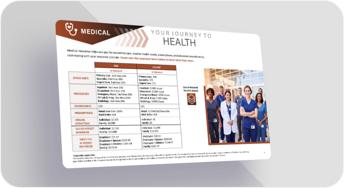 4 MEDICAL Medical insurance helps you pay for preventive care, routine health needs, prescriptions, and advanced procedures by cost-sharing with your insurance provider. Hover over the insurance terms below to learn what they mean. Y O U R J O U R N E Y T O HEALTH HSA CO-PAY In Network In Network OFFICE VISITS Primary Care: Ded then 20% Specialist: Ded then 20% Urgent Care: Ded then 20% Primary Care: $30 Specialist: $75 Urgent Care: $75 PROCEDURES Inpatient: Ded then 20% Outpatient: Ded then 20% Emergency Room: Ded then 20% OP Lab & X-ray: Ded then $200 Radiology: Ded then 20% Inpatient: $1000 copay Outpatient: $1000 copay Emergency Room: $250 copay OP Lab & X-ray: $100 Copay Radiology: $1000 Copay COINSURANCE 20% N/A PRESCRIPTIONS Retail: Ded then 100% Mail Order: N/A Retail: $5/$40/$80/Rescrybe Mail Order: N/A ANNUAL DEDUCTIBLE Individual: $3,000 Family: $6,000 Individual: $0 Family: $0 OUT-OF-POCKET MAXIMUM Individual: $7,500 Family: $15,000 Individual: $5,000 Family: $10,000 RATES PER BI-WEEKLY PAY PERIOD Employee: $31.62 Employee + Spouse: $163.93 Employee + Children: $145.84 Family: $275.35 Employee: $28.22 Employee + Spouse: $155.24 Employee + Children: $134.07 Family: $262.49 *Deductible applies first. The benefits and rates in this guide are for illustrative purposes only. Please refer to the Summary of Benefits for specific benefits. To the extent the rates or the benefit plan information summarized herein differs from the underlying plan details specified in the insurance documents that govern the terms and conditions of the plans of insurance described in this guide, the underlying insurance documents will govern in all cases. Out of Network Benefits Search