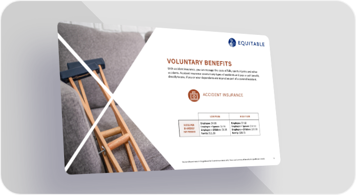14 The benefits and rates in this guide are for illustrative purposes only. Please see Summary of Benefits for specific plan details. VOLUNTARY BENEFITS With accident insurance, you can manage the costs of falls, sports injuries and other accidents. Accident insurance covers many types of accidents and pays a cash benefit, directly to you, if you or your dependents are injured as part of a covered accident. ACCIDENT INSURANCE LOW PLAN HIGH PLAN RATES PER BI-WEEKLY PAY PERIOD Employee: $4.06 Employee + Spouse: $6.96 Employee + Children: $8.38 Family: $11.28 Employee: $7.12 Employee + Spouse: $12.62 Employee + Children: $15.33 Family: $20.73