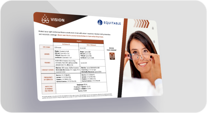 10 VISION Protect your sight and enjoy those sunsets even more with vision insurance. Receive both preventive and materials coverage. Hover over the insurance terms below to learn what they mean. PLAN I In Network Out of Network EYE EXAM $10 copay Up to $45 LENSES Single: Covered in full Bifocal: Covered in full Trifocal: Covered in full Lenticular: Covered in full Single: Up to $30 Bifocal: Up to $50 Trifocal: Up to $65 Lenticular: Up to $100 FRAMES $130-150 allowance depending on brand, then 20% savings on the amount over the allowance Up to $70 CONTACT LENSES Elective: $60 copay; $130 allowance Medically Necessary: $25 copay then covered in full Elective: Up to $30/50/65/100 depending on lense type Medically Necessary: Up to $210 FREQUENCY OF SERVICES Exams:1 X 12 Months Lenses: 1 X 12 Months Frames: 1 X 24 Months Contact Lenses: 1 X 12 Months Exams:1 X 12 Months Lenses: 1 X 12 Months Frames: 1 X 24 Months Contact Lenses: 1 X 12 Month RATES PER BI-WEEKLY PAY PERIOD Employee: $0.24 Employee + Spouse: $2.01 Employee + Children: $2.05 Family: $3.25 The benefits and rates in this guide are for illustrative purposes only. To the extent the rates or the benefit plan information summarized herein differs from the underlying plan details specified in the insurance documents that govern the terms and conditions of the plans of insurance described in this guide, the underlying insurance documents will govern in all cases. REVIEW PLAN SUMMARY