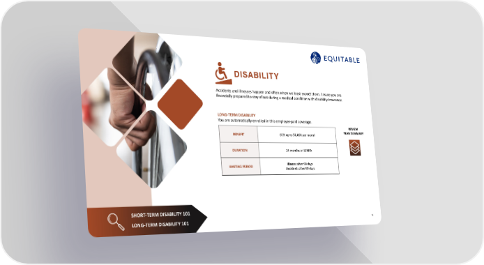 12 Accidents and illnesses happen and often when we least expect them. Ensure you are financially prepared to stay afloat during a medical condition with disability insurance. SHORT-TERM DISABILITY 101 LONG-TERM DISABILITY 101 LONG-TERM DISABILITY You are automatically enrolled in this employer-paid coverage. BENEFIT 60% up to $6,000 per month DURATION 24 months or SSNRA WAITING PERIOD Illness: after 90 days Accident: after 90 days REVIEW PLAN SUMMARY DISABILITY