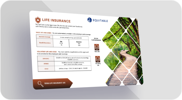 11 You can't put a price tag on your life, but you can protect your loved ones with life insurance in the event of a premature loss. BASIC LIFE AND AD&D - You are automatically enrolled in this employer-paid coverage. Available Coverage 1x basic annual earnings, up to $250,000 Benefit Reductions Age 65-69 70 Reduction 35% 50% VOLUNTARY LIFE AND AD&D - You must submit an application and be approved to be enrolled in this employee-paid coverage. EMPLOYEE $10,000 to $500,000 not to exceed 5 x basic annual earnings; $10,000 increments SPOUSE $5,000 to $250,000 in $5,000 increments, not to exceed 50% of EE’s amount CHILD Birth to 14 days = $500 / 15 days to age 26 = $10,000 TERM LIFE INSURANCE 101 REVIEW PLAN SUMMARIES LIFE INSURANCE Basic Life Voluntary Life
