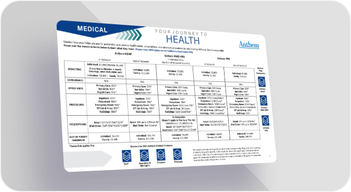 4 MEDICAL Medical insurance helps you pay for preventive care, routine health needs, prescriptions, and advanced procedures by cost-sharing with your insurance provider. Hover over the insurance terms below to learn what they mean. Please note: HMO plans are for California Employees Only. Y O U R J O U R N E Y T O HEALTH DEDUCTIBLE Individual: $2,000 | Family: $5,000 If enrolled as Member + Family Coverage, then Deductibles are: Individual: $3,400 | Family: $5,000 Individual: 6,000 Family: $12,000 Individual: $3,000 Family: $6,000 Individual: $3,000 Family: $6,000 Individual: $9,000 Family: $18,000 COINSURANCE 90% 70% 70% 70% 50% OFFICE VISITS Primary Care: 90%* Specialist: 90%* Urgent Care: 90%* Primary Care: 70%* Specialist: 70%* Urgent Care:70%* Primary Care: $30 Copay Specialist: $50 Copay Urgent Care: $30 Copay Primary Care: $30 Copay Specialist: $60 Copay Urgent Care: $30 Copay Primary Care: 50%* Specialist: 50%* Urgent Care: 50%* PROCEDURES Inpatient: 90%* Outpatient: 90%* Emergency Room: 90%* OP Lab & X-ray: 90%* Radiology: 90%* Inpatient: 70%* Outpatient: 70%* Emergency Room: 70%* OP Lab & X-ray: 70%* Radiology: 70%* Inpatient: 70%* Outpatient: 70%* Emergency Room: $250 then 70%* OP Lab & X-ray: $0 Copay Radiology: $125 Copay/Day* Inpatient: $750 Copay/Admin. Outpatient: $500 Copay* Emergency Room: $250 Copay* (Deductible Waived if Admitted) OP Lab & X-ray: $60 Copay* Radiology: $200 Copay/Day* Inpatient: 50%* Outpatient: 50%* Emergency Room: $250 Copay* (Deductible Waived if Admitted) OP Lab & X-ray: 50%* Radiology: 50%* PRESCRIPTIONS Retail: $5*/$15*/$40*/$60* Mail Order: $10*/$30*/$100*/$150* Retail: 30% up to $250 per Rx* Mail Order: Not Covered Rx Deductible (Doesn’t apply to Tier 1a or Tier 1b): $500/Person | $1,500/Family Retail: $5*/$20*/$50*/$75* Mail Order: $10*/$40*/$125*/$188* Retail: $5/$20/$30/$50 Mail Order: $10/$40/$75/$125 Retail: 50% up to $250/Rx* Mail Order: 50% up to $250/Rx* OUT-OF-POCKET MAXIMUM Individual: $4,250 Family: $8,500 Individual: $12,750 Family: $25,500 Individual: $6,400 Family: $12,800 Individual: $8,000 Family: $16,000 Individual: $24,000 Family: $48,000 Anthem HDHP Anthem HMO HRA Anthem PPO *Deductible applies first Review Plan Summaries Anthem HDHP Anthem HMO HRA Anthem PPO In-Network In-Network Only (No Out-of-Network Benefits) In-Network Out-of-Network Out-of-Network Click to View 2026 Anthem Medical Premiums The benefits and rates in this guide are for illustrative purposes only. Please refer to the Summary of Benefits for specific benefits. To the extent the rates or the benefit plan information summa- rized herein differs from the underlying plan details specified in the insurance documents that govern the terms and conditions of the plans of insurance described in this guide, the underlying insurance documents will govern in all cases. Staff Principals Directors Associates & Managers