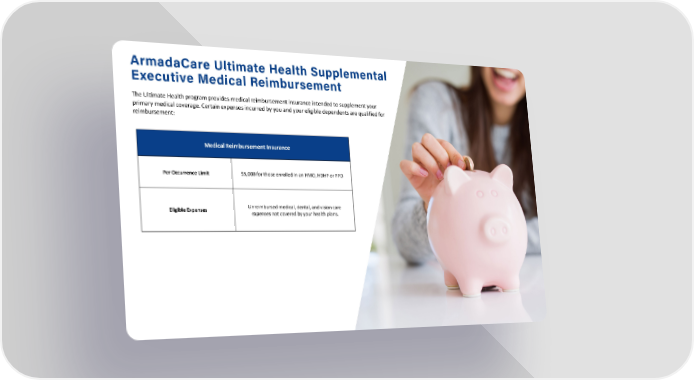 17 ArmadaCare Ultimate Health Supplemental Executive Medical Reimbursement The Ultimate Health program provides medical reimbursement insurance intended to supplement your primary medical coverage. Certain expenses incurred by you and your eligible dependents are qualified for reimbursement: Medical Reimbursement Insurance Per Occurrence Limit $5,000 for those enrolled in an HMO, HDHP or PPO Eligible Expenses Unreimbursed medical, dental, and vision care expenses not covered by your health plans.