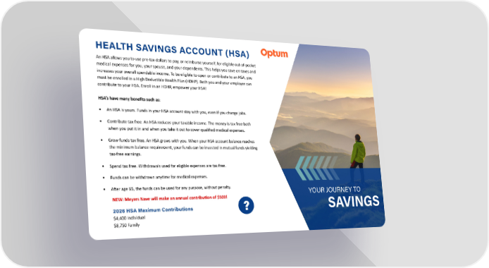 6 HEALTH SAVINGS ACCOUNT (HSA) An HSA allows you to use pre-tax dollars to pay, or reimburse yourself, for eligible out-of-pocket medical expenses for you, your spouse, and your dependents. This helps you save on taxes and increases your overall spendable income. To be eligible to open or contribute to an HSA, you must be enrolled in a High Deductible Health Plan (HDHP). Both you and your employer can contribute to your HSA. Enroll in an HDHP, empower your HSA! HSA’s have many benefits such as: • An HSA is yours. Funds in your HSA account stay with you, even if you change jobs. • Contribute tax free. An HSA reduces your taxable income. The money is tax free both when you put it in and when you take it out to cover qualified medical expenses. • Grow funds tax free. An HSA grows with you. When your HSA account balance reaches the minimum balance requirement, your funds can be invested in mutual funds yielding tax-free earnings. • Spend tax free. Withdrawals used for eligible expenses are tax free. • Funds can be withdrawn anytime for medical expenses. • After age 65, the funds can be used for any purpose, without penalty. 2026 HSA Maximum Contributions $4,400 Individual $8,750 Family YOUR JOURNEY TO SAVINGS ? NEW: Meyers Nave will make an annual contribution of $500!
