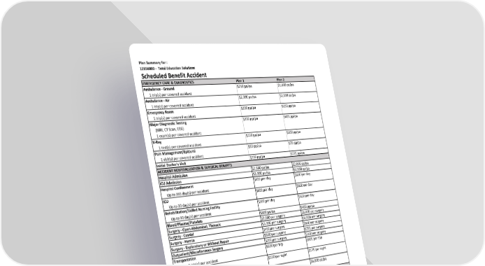Description of Benefits for : 12856000 - Total Education Solutions Scheduled Benefit Accident EMERGENCY CARE & DIAGNOSTICS Ambulance Transportation Benefit This benefit pays for ground or air ambulance transportation as shown in the Schedule of Benefits. It will be paid for transportation by a licensed ground or air ambulance transportation service from the place of injury to the nearest accredited hospital where adequate treatment facilities are available. Air ambulance transportation must be within 96 hours of the accident. Ground transportation must be within 90 days of the accident. Emergency Room Benefit The benefit amount shown in the Schedule of Benefits will be paid for treatment in an emergency room for an injury. Emergency room services must be incurred within 30 days from the Accident. Major Diagnostic Testing Benefit The benefit amount shown in the Schedule of Benefits will be paid if for any of the following major diagnostic tests as the result of the injury. Tests must be administered by a provider within 365 days of the accident. If multiple tests are performed, only one benefit will be paid. The following tests are covered: magnetic resonance imaging (MRI), computed tomography (CT, Cat Scan), electrocardiogram (EKG) and electroencephalogram. X-Ray Benefit The benefit amount shown in the Schedule of Benefits will be paid if an x-ray is performed as a result of the injury. The x-ray must be performed by a provider within 365 days of the accident. Pain Management/Epidural Benefit The benefit amount shown in the Schedule of Benefits will be paid if medical pain management services, including the application of epidural injections, are administered for treatment of injury. Services must be administered by a provider within 365 days of the accident. Services may be provided at the doctor's office, outpatient hospital clinic or urgent care facility. Initial Doctor Visit Benefit The benefit amount shown in the Schedule of Benefits will be paid for the first day of treatment from a doctor for an injury. The initial visit must occur within 365 days of the accident. Services must be provided at the doctor's office, an outpatient hospital clinic or urgent care facility. This benefit is payable once per person, per accident.