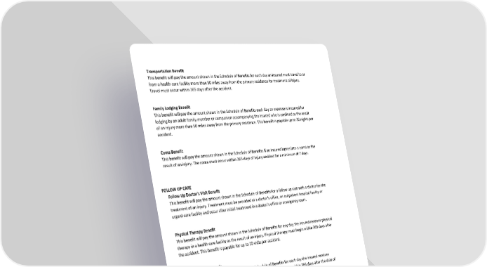 Transportation Benefit This benefit will pay the amount shown in the Schedule of Benefits for each day an insured must travel to or from a health care facility more than 50 miles away from the primary residence for treatment of injury. Travel must occur within 365 days after the accident. Family Lodging Benefit This benefit will pay the amount shown in the Schedule of Benefits each day an expense is incurred for lodging by an adult family member or companion accompanying the insured who is confined as the result of an injury more than 50 miles away from the primary residence. This benefit is payable up to 30 nights per accident. Coma Benefit This benefit will pay the amount shown in the Schedule of Benefits if an insured lapses into a coma as the result of an injury. The coma must occur within 365 days of injury and last for a minimum of 7 days. FOLLOW UP CARE Follow Up Doctor's Visit Benefit This benefit will pay the amount shown in the Schedule of Benefits for a follow up visit with a doctor for the treatment of an injury. Treatment must be provided at a doctor's office, an outpatient hospital facility or urgent care facility and occur after initial treatment in a doctor's office or emergency room. Physical Therapy Benefit This benefit will pay the amount shown in the Schedule of Benefits for any day the insured receives physical therapy in a health care facility as the result of an injury. Physical therapy must begin within 365 days after the accident. This benefit is payable for up to 10 visits per accident. Chiropractic Visit Benefit This benefit will pay the amount shown in the Schedule of Benefits for each day the insured receives chiropractic care as the result of an injury. Chiropractic care must begin within 365 days after the date of the accident. This benefit is payable for up to 10 visits per accident. Medical Equipment Benefit This benefit will pay the amount shown in the Schedule of Benefits if the insured rents or buys durable medical equipment as the result of an injury. The medical equipment must be prescribed by a doctor within 365 days after the injury occurs. Prosthetic Device Benefit This benefit will pay the amount shown in the Schedule of Benefits if the insured purchases a prosthetic device as the result of an injury. The prosthetic device must be prescribed by a doctor within 365 days after the injury occurs.
