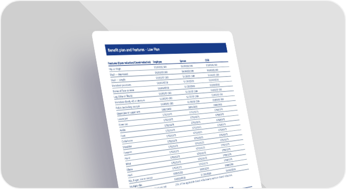 Page 3 Benefit plan and Features - Low Plan Fractures (Open reduction/Closed reduction) Employee Spouse Child Hip or thigh $5,000/$2,500 $5,000/$2,500 $5,000/$2,500 Skull — depressed $6,000/$3,000 $6,000/$3,000 $6,000/$3,000 Skull — simple $3,000/$1,500 $3,000/$1,500 $3,000/$1,500 Vertebral processes $1,000/$500 $1,000/$500 $1,000/$500 Bones of face or nose $1,000/$500 $1,000/$500 $1,000/$500 Leg (tibia or fibula) $3,000/$1,500 $3,000/$1,500 $3,000/$1,500 Vertebrae (body of) or sternum $2,000/$1,000 $2,000/$1,000 $2,000/$1,000 Pelvis (excluding coccyx) $3,000/$1,500 $3,000/$1,500 $3,000/$1,500 Upper jaw or upper arm $800/$400 $800/$400 $800/$400 Lower jaw $750/$375 $750/$375 $750/$375 Knee cap $750/$375 $750/$375 $750/$375 Ankle $750/$375 $750/$375 $750/$375 Foot $750/$375 $750/$375 $750/$375 Collarbone $750/$375 $750/$375 $750/$375 Shoulder $750/$375 $750/$375 $750/$375 Forearm $750/$375 $750/$375 $750/$375 Hand $750/$375 $750/$375 $750/$375 Wrist $750/$375 $750/$375 $750/$375 Elbow $750/$375 $750/$375 $750/$375 Heel $750/$375 $750/$375 $750/$375 Rib, finger, toe or coccyx $500/$250 $500/$250 $500/$250 Multiple ribs $1,000/$500 $1,000/$500 $1,000/$500 Chip fractures and other fractures not reduced 25% of the applicable closed reduction by open or closed reduction Additional injuries Employee Spouse Child Eye injury $300 $300 $300 Gunshot wound $250 $250 $250 Brain injury $500 $500 $500 Paralysis — monoplegia $1,000 $1,000 $1,000 Paralysis — diplegia $2,500 $2,500 $2,500 Paralysis — hemiplegia $2,500 $2,500 $2,500 Paralysis — paraplegia $12,500 $12,500 $12,500 Paralysis — quadriplegia $25,000 $25,000 $25,000 Coma $7,500 $7,500 $7,500 Concussion $150 $150 $150 Concussion lifetime maximum benefit $1,500 $1,500 $1,500