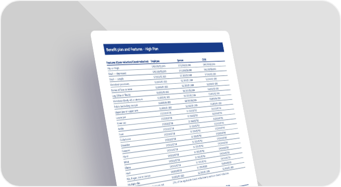 Page 11 Benefit plan and Features - High Plan Fractures (Open reduction/Closed reduction) Employee Spouse Child Hip or thigh $10,000/$5,000 $10,000/$5,000 $10,000/$5,000 Skull — depressed $12,000/$6,000 $12,000/$6,000 $12,000/$6,000 Skull — simple $7,000/$3,500 $7,000/$3,500 $7,000/$3,500 Vertebral processes $2,000/$1,000 $2,000/$1,000 $2,000/$1,000 Bones of face or nose $2,000/$1,000 $2,000/$1,000 $2,000/$1,000 Leg (tibia or fibula) $6,000/$3,000 $6,000/$3,000 $6,000/$3,000 Vertebrae (body of) or sternum $5,000/$2,500 $5,000/$2,500 $5,000/$2,500 Pelvis (excluding coccyx) $8,000/$4,000 $8,000/$4,000 $8,000/$4,000 Upper jaw or upper arm $2,000/$1,000 $2,000/$1,000 $2,000/$1,000 Lower jaw $1,500/$750 $1,500/$750 $1,500/$750 Knee cap $1,500/$750 $1,500/$750 $1,500/$750 Ankle $1,500/$750 $1,500/$750 $1,500/$750 Foot $1,500/$750 $1,500/$750 $1,500/$750 Collarbone $1,500/$750 $1,500/$750 $1,500/$750 Shoulder $1,500/$750 $1,500/$750 $1,500/$750 Forearm $1,500/$750 $1,500/$750 $1,500/$750 Hand $1,500/$750 $1,500/$750 $1,500/$750 Wrist $1,500/$750 $1,500/$750 $1,500/$750 Elbow $1,500/$750 $1,500/$750 $1,500/$750 Heel $1,500/$750 $1,500/$750 $1,500/$750 Rib, finger, toe or coccyx $1,000/$500 $1,000/$500 $1,000/$500 Multiple ribs $2,000/$1,000 $2,000/$1,000 $2,000/$1,000 Chip fractures and other fractures not reduced 25% of the applicable closed reduction by open or closed reduction Additional injuries Employee Spouse Child Eye injury $600 $600 $600 Gunshot wound $500 $500 $500 Brain injury $1,000 $1,000 $1,000 Paralysis — monoplegia $2,500 $2,500 $2,500 Paralysis — diplegia $5,000 $5,000 $5,000 Paralysis — hemiplegia $5,000 $5,000 $5,000 Paralysis — paraplegia $25,000 $25,000 $25,000 Paralysis — quadriplegia $50,000 $50,000 $50,000 Coma $10,000 $10,000 $10,000 Concussion $200 $200 $200 Concussion lifetime maximum benefit $2,000 $2,000 $2,000