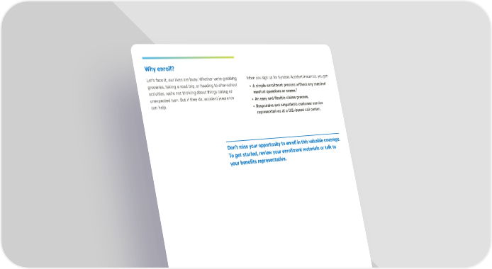 Why enroll? Let’s face it, our lives are busy. Whether we’re grabbing When you sign up for Symetra Accident Insurance, you get: groceries, taking a road trip, or heading to after-school • A simple enrollment process without any required activities, we’re not thinking about things taking an medical questions or exams.2 unexpected turn. But if they do, accident insurance • An easy and flexible claims process. can help. • Responsive and empathetic customer service representatives at a U.S.-based call center. Don’t miss your opportunity to enroll in this valuable coverage. To get started, review your enrollment materials or talk to your benefits representative. Accident coverage, insured by Symetra Life Insurance Company, 777 108th Ave NE, Suite 1200, Bellevue, WA 98004, is not available in all U.S. states or any U.S. territory. It pays a 昀椀xed amount and does not cover losses due to sickness, nor does it cover the cost of all hospital and medical services. It is not a replacement for major medical or other comprehensive coverage and does not satisfy the minimum essential coverage requirements of the Affordable Care Act. Certi昀椀cate form number is SBC-03515 1/18. Coverage may be subject to exclusions, limitations, reductions and termination of bene昀椀t provisions. For costs and complete details of the coverage, contact your bene昀椀ts representative. Symetra Life Insurance Company THIS POLICY IS ISSUED AS AN ACCIDENT-ONLY POLICY. IT DOES NOT PAY BENEFITS FOR LOSS 777 108th Avenue NE, Suite 1200 CAUSED BY ILLNESS. Bellevue, WA 98004-5135 1 www.symetra.com “National Hospital Ambulatory Medical Care Survey,” Centers for Disease Control and Prevention, accessed March 8, 2023. 2 Symetra® is a registered service mark of Late entrants and those who elect coverage over the guaranteed issue amount outlined in the plan design will have to Symetra Life Insurance Company. complete a medical questionnaire.