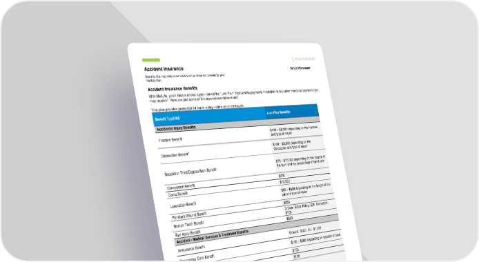 PLAN SUMMARY Accident Insurance Benefits that may help cover costs such as those not covered by your medical plan. Salus Homecare ADF# AI664.14 Accident Insurance Benefits With MetLife, you’ll have a choice a plan (called the “Low Plan” that provide payments in addition to any other insurance payments you may receive1. Here are just some of the covered events/services2. This plan provides protection 24 hours a day—while on or off the job. Benefit Typ0065 Low Plan Benefits Accidental Injury Benefits Fracture Benefit* $100 – $8,000 depending on the fracture and type of repair Dislocation Benefit* $100 – $8,000 depending on the dislocation and type of repair Second or Third Degree Burn Benefit $75 – $10,000 depending on the degree of the burn and the percentage of burnt skin Concussion Benefit $250 Coma Benefit $10,000 Laceration Benefit $50 – $400 depending on the length of the cut and type of repair Puncture Wound Benefit $250 Broken Tooth Benefit Crown: $200 Filling: $25 Extraction: $100 Eye Injury Benefit $300 Accident - Medical Services & Treatment Benefits Ambulance Benefit Ground: $300 Air: $1,000 Emergency Care Benefit $100 – $200 depending on location of care Non-Emergency Initial Care Benefit $100 Physician Follow-Up Visit Benefit $100 Therapy Services Benefit $50 (including physical therapy) Medical Testing Benefit $150 Medical Appliance Benefit $75 – $750 depending on the appliance Transportation Benefit $300 Pain Management Benefit $75 (for epidural anesthesia) Prosthetic Device Benefit One device: $750 More than one device: $1,500