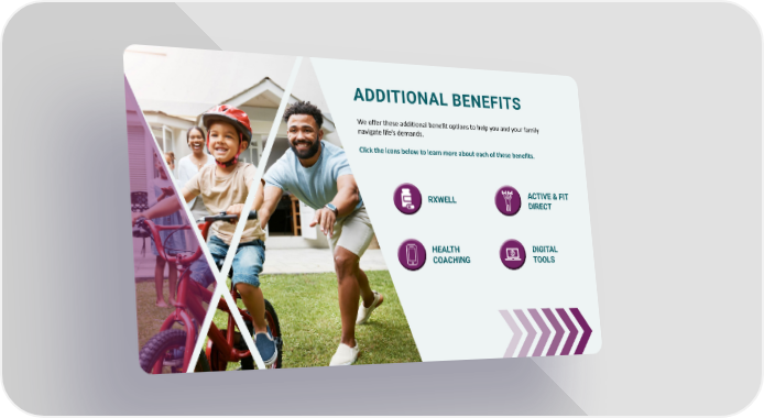 ADDITIONAL BENEFITS We offer these additional benefit options to help you and your family navigate life’s demands. Click the icons below to learn more about each of these benefits. RXWELL HEALTH COACHING ACTIVE & FIT DIRECT DIGITAL TOOLS