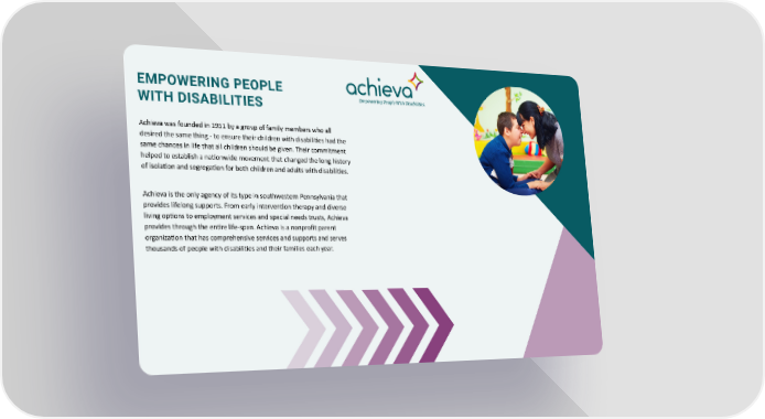 EMPOWERING PEOPLE WITH DISABILITIES Achieva was founded in 1951 by a group of family members who all desired the same thing - to ensure their children with disabilities had the same chances in life that all children should be given. Their commitment helped to establish a nationwide movement that changed the long history of isolation and segregation for both children and adults with disabilities. Achieva is the only agency of its type in southwestern Pennsylvania that provides lifelong supports. From early intervention therapy and diverse living options to employment services and special needs trusts, Achieva provides through the entire life-span. Achieva is a nonprofit parent organization that has comprehensive services and supports and serves thousands of people with disabilities and their families each year.