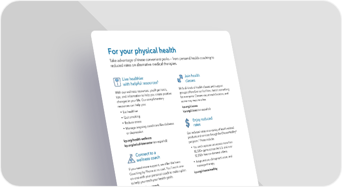 For your physical health Take advantage of these convenient perks — from personal health coaching to reduced rates on alternative medical therapies. Live healthier Join health with helpful resources5 classes With our wellness resources, you’ll get tools, With all kinds of health classes and support tips, and information to help you create positive groups offered at our facilities, there’s something changes in your life. Our complimentary for everyone. Classes vary at each location, and resources can help you: some may require a fee. • Eat healthier kp.org/classes • kp.org/clases (en español) Quit smoking • Reduce stress • E njoy reduced Manage ongoing conditions like diabetes or depression rates kp.org/health-wellness Get reduced rates on a variety of health-related kp.org/salud-bienestar (en español) products and services through the ChooseHealthy® 6 program. These include: • C onnect to a You and a spouse can access more than wellness coach 12,500+ gyms across the U.S. and over 12,000+ free on-demand videos. If you need more support, we offer Wellness • Coaching by Phone at no cost. You’ll work one- Acupuncture, chiropractic care, and on-one with your personal coach to make a plan massage therapy to help you reach your health goals. kp.org/choosehealthy kp.org/wellnesscoach Making the switch to great care is easy Are you new to Kaiser Permanente? Thinking about joining? It’s simple to get started with your new plan — and we’re here to walk you through it. Get started with Kaiser Permanente at kp.org/easyswitch.