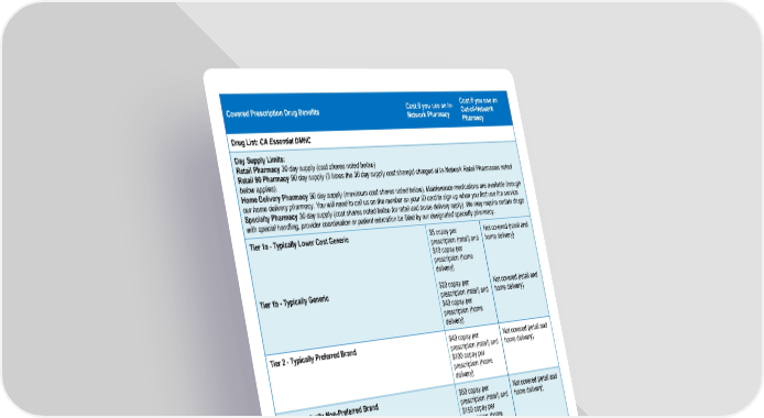 Cost if you use an In- Cost if you use an Covered Prescription Drug Benefits Network Pharmacy Out-of-Network Pharmacy Drug List: CA Essential DMHC Day Supply Limits: Retail Pharmacy 30 day supply (cost shares noted below) Retail 90 Pharmacy 90 day supply (3 times the 30 day supply cost share(s) charged at In-Network Retail Pharmacies noted below applies). Home Delivery Pharmacy 90 day supply (maximum cost shares noted below). Maintenance medications are available through our home delivery pharmacy. You will need to call us on the number on your ID card to sign up when you first use the service. Specialty Pharmacy 30 day supply (cost shares noted below for retail and home delivery apply). We may require certain drugs with special handling, provider coordination or patient education be filled by our designated specialty pharmacy. Tier 1a - Typically Lower Cost Generic $5 copay per Not covered (retail and prescription (retail) and home delivery) $10 copay per prescription (home delivery) Tier 1b - Typically Generic $20 copay per Not covered (retail and prescription (retail) and home delivery) $40 copay per prescription (home delivery) Tier 2 - Typically Preferred Brand $40 copay per Not covered (retail and prescription (retail) and home delivery) $100 copay per prescription (home delivery) Tier 3 - Typically Non-Preferred Brand $60 copay per Not covered (retail and prescription (retail) and home delivery) $150 copay per prescription (home delivery) Tier 4 - Typically Specialty (brand and generic) 30% coinsurance up to Not covered (retail and $250 per prescription home delivery) (retail and home delivery) Cost if you use an In- Cost if you use an Covered Vision Benefits Network Provider Out-of-Network Provider This is a brief outline of your vision coverage. To receive the In-Network benefit, you must use a Blue View Vision Provider. Only children's vision services count towards your out-of-pocket limit. Children’s Vision exam (up to age 19) No charge Not covered Limited to 1 exam per benefit period. Page 5 of 9