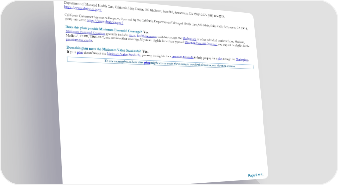 Department of Managed Health Care, California Help Center, 980 9th Street, Suite 500, Sacramento, CA 95814-2725, (888) 466-2219, https://www.dmhc.ca.gov/ California Consumer Assistance Program, Operated by the California Department of Managed Health Care, 980 9th St, Suite #500, Sacramento, CA 95814, (888) 466-2219, https://www.dmhc.ca.gov/ Does this plan provide Minimum Essential Coverage? Yes. Minimum Essential Coverage generally includes plans, health insurance available through the Marketplace or other individual market policies, Medicare, Medicaid, CHIP, TRICARE, and certain other coverage. If you are eligible for certain types of Minimum Essential Coverage, you may not be eligible for the premium tax credit. Does this plan meet the Minimum Value Standards? Yes. If your plan doesn’t meet the Minimum Value Standards, you may be eligible for a premium tax credit to help you pay for a plan through the Marketplace. To see examples of how this plan might cover costs for a sample medical situation, see the next section. Page 5 of 11