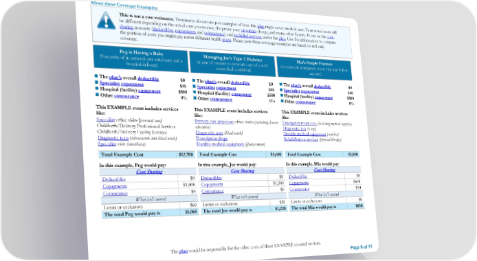 About these Coverage Examples: This is not a cost estimator. Treatments shown are just examples of how this plan might cover medical care. Your actual costs will be different depending on the actual care you receive, the prices your providers charge, and many other factors. Focus on the cost- sharing amounts (deductibles, copayments and coinsurance) and excluded services under the plan. Use this information to compare the portion of costs you might pay under different health plans. Please note these coverage examples are based on self-only coverage. Peg is Having a Baby Managing Joe’s Type 2 Diabetes Mia’s Simple Fracture (9 months of in-network pre-natal care and a (a year of routine in-network care of a well- (in-network emergency room visit and follow hospital delivery) controlled condition) up care) The plan’s overall deductible $0 The plan’s overall deductible $0 The plan’s overall deductible $0 Specialist copayment $40 Specialist copayment $40 Specialist copayment $40 Hospital (facility) copayment $500 Hospital (facility) copayment $500 Hospital (facility) copayment $500 Other coinsurance 0% Other coinsurance 0% Other coinsurance 0% This EXAMPLE event includes services This EXAMPLE event includes services This EXAMPLE event includes services like: like: like: Specialist office visits (prenatal care) Primary care physician office visits (including disease Emergency room care (including medical supplies) Childbirth/Delivery Professional Services education) Diagnostic test (x-ray) Childbirth/Delivery Facility Services Diagnostic tests (blood work) Durable medical equipment (crutches) Diagnostic tests (ultrasounds and blood work) Prescription drugs Rehabilitation services (physical therapy) Specialist visit (anesthesia) Durable medical equipment (glucose meter) Total Example Cost $12,700 Total Example Cost $5,600 Total Example Cost $2,800 In this example, Peg would pay: In this example, Joe would pay: In this example, Mia would pay: Cost Sharing Cost Sharing Cost Sharing Deductibles $0 Deductibles $0 Deductibles $0 Copayments $1,000 Copayments $1,200 Copayments $600 Coinsurance $0 Coinsurance $0 Coinsurance $50 What isn’t covered What isn’t covered What isn’t covered Limits or exclusions $60 Limits or exclusions $20 Limits or exclusions $0 The total Peg would pay is $1,060 The total Joe would pay is $1,220 The total Mia would pay is $650 The plan would be responsible for the other costs of these EXAMPLE covered services. Page 6 of 11