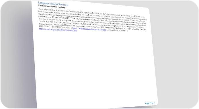 Language Access Services: It’s important we treat you fairly That’s why we follow federal civil rights laws in our health programs and activities. We don’t discriminate, exclude people, or treat them differently on the basis of race, color, national origin, sex, age or disability. For people with disabilities, we offer free aids and services. For people whose primary language isn’t English, we offer free language assistance services through interpreters and other written languages. Interested in these services? Call the Member Services number on your ID card for help (TTY/TDD: 711). If you think we failed to offer these services or discriminated based on race, color, national origin, age, disability, or sex, you can file a complaint, also known as a grievance. You can file a complaint with our Compliance Coordinator in writing to Compliance Coordinator, P.O. Box 27401, Mail Drop VA2002-N160, Richmond, VA 23279. Or you can file a complaint with the U.S. Department of Health and Human Services, Office for Civil Rights at 200 Independence Avenue, SW; Room 509F, HHH Building; Washington, D.C. 20201 or by calling 1-800-368- 1019 (TDD: 1- 800-537-7697) or online at https://ocrportal.hhs.gov/ocr/portal/lobby.jsf. Complaint forms are available at http://www.hhs.gov/ocr/office/file/index.html. Page 11 of 11