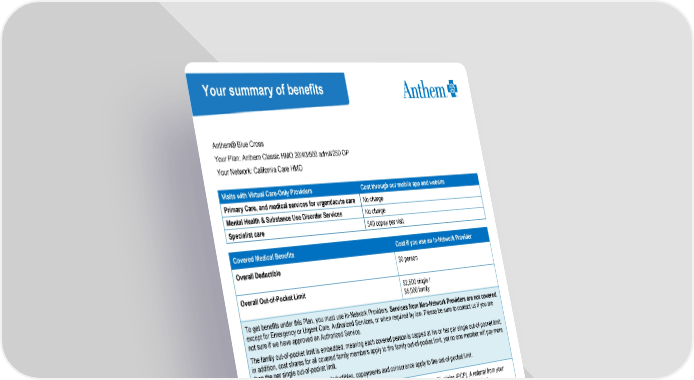 Your summary of benefits AnthemĀ® Blue Cross Your Plan: Anthem Classic HMO 20/40/500 admit/250 OP Your Network: California Care HMO Visits with Virtual Care-Only Providers Cost through our mobile app and website Primary Care, and medical services for urgent/acute care No charge Mental Health & Substance Use Disorder Services No charge Specialist care $40 copay per visit Covered Medical Benefits Cost if you use an In-Network Provider Overall Deductible $0 person Overall Out-of-Pocket Limit $2,500 single / $5,000 family To get benefits under this Plan, you must use In-Network Providers. Services from Non-Network Providers are not covered, except for Emergency or Urgent Care, Authorized Services, or when required by law. Please be sure to contact us if you are not sure if we have approved an Authorized Service. The family out-of-pocket limit is embedded, meaning each covered person is capped at his or her per single out-of-pocket limit; in addition, cost shares for all covered family members apply to the family out-of-pocket limit, yet no one member will pay more than the per single out-of-pocket limit. All medical and prescription drug deductibles, copayments and coinsurance apply to the out-of-pocket limit. Doctor Visits (virtual and office) Your plan requires the selection of a Primary Care Physician (PCP). A referral from your Primary Care Physician (PCP) is required for Specialist care and most other providers for select covered services. Primary Care (PCP) and Mental Health and Substance Use Disorder $20 copay per visit Services virtual and office Specialist Care virtual and office $40 copay per visit Other Practitioner Visits Routine Maternity Care (Prenatal and Postnatal) $20 copay per visit Retail Health Clinic for routine care and treatment of common illnesses; $20 copay per visit usually found in major pharmacies or retail stores. CA/LG/Anthem Classic HMO 20/40/500 admit/250 OP/AN9Z/01-01-2024 Page 1 of 9