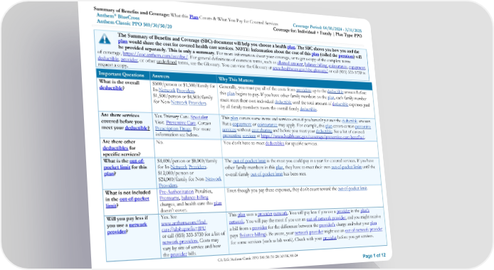 Does this plan provide Minimum Essential Coverage? Yes. Minimum Essential Coverage generally includes plans, health insurance available through the Marketplace or other individual market policies, Medicare, Medicaid, CHIP, TRICARE, and certain other coverage. If you are eligible for certain types of Minimum Essential Coverage, you may not be eligible for the premium tax credit. Does this plan meet the Minimum Value Standards? Yes. If your plan doesn’t meet the Minimum Value Standards, you may be eligible for a premium tax credit to help you pay for a plan through the Marketplace. To see examples of how this plan might cover costs for a sample medical situation, see the next section. Page 6 of 12