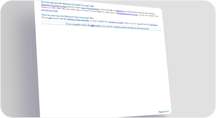 Does this plan provide Minimum Essential Coverage? Yes. Minimum Essential Coverage generally includes plans, health insurance available through the Marketplace or other individual market policies, Medicare, Medicaid, CHIP, TRICARE, and certain other coverage. If you are eligible for certain types of Minimum Essential Coverage, you may not be eligible for the premium tax credit. Does this plan meet the Minimum Value Standards? Yes. If your plan doesn’t meet the Minimum Value Standards, you may be eligible for a premium tax credit to help you pay for a plan through the Marketplace. To see examples of how this plan might cover costs for a sample medical situation, see the next section. Page 6 of 12