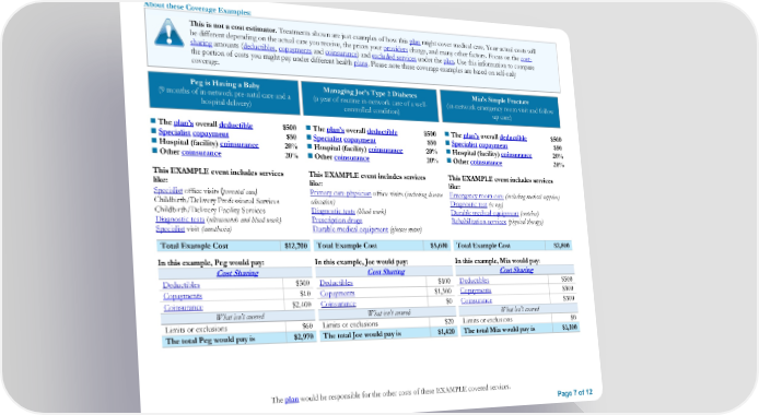About these Coverage Examples: This is not a cost estimator. Treatments shown are just examples of how this plan might cover medical care. Your actual costs will be different depending on the actual care you receive, the prices your providers charge, and many other factors. Focus on the cost- sharing amounts (deductibles, copayments and coinsurance) and excluded services under the plan. Use this information to compare the portion of costs you might pay under different health plans. Please note these coverage examples are based on self-only coverage. Peg is Having a Baby Managing Joe’s Type 2 Diabetes Mia’s Simple Fracture (9 months of in-network pre-natal care and a (a year of routine in-network care of a well- (in-network emergency room visit and follow hospital delivery) controlled condition) up care) The plan’s overall deductible $500 The plan’s overall deductible $500 The plan’s overall deductible $500 Specialist copayment $50 Specialist copayment $50 Specialist copayment $50 Hospital (facility) coinsurance 20% Hospital (facility) coinsurance 20% Hospital (facility) coinsurance 20% Other coinsurance 20% Other coinsurance 20% Other coinsurance 20% This EXAMPLE event includes services This EXAMPLE event includes services This EXAMPLE event includes services like: like: like: Specialist office visits (prenatal care) Primary care physician office visits (including disease Emergency room care (including medical supplies) Childbirth/Delivery Professional Services education) Diagnostic test (x-ray) Childbirth/Delivery Facility Services Diagnostic tests (blood work) Durable medical equipment (crutches) Diagnostic tests (ultrasounds and blood work) Prescription drugs Rehabilitation services (physical therapy) Specialist visit (anesthesia) Durable medical equipment (glucose meter) Total Example Cost $12,700 Total Example Cost $5,600 Total Example Cost $2,800 In this example, Peg would pay: In this example, Joe would pay: In this example, Mia would pay: Cost Sharing Cost Sharing Cost Sharing Deductibles $500 Deductibles $100 Deductibles $500 Copayments $10 Copayments $1,300 Copayments $300 Coinsurance $2,400 Coinsurance $0 Coinsurance $300 What isn’t covered What isn’t covered What isn’t covered Limits or exclusions $60 Limits or exclusions $20 Limits or exclusions $0 The total Peg would pay is $2,970 The total Joe would pay is $1,420 The total Mia would pay is $1,100 The plan would be responsible for the other costs of these EXAMPLE covered services. Page 7 of 12