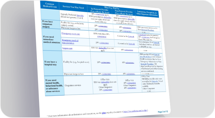 Common What You Will Pay Limitations, Exceptions, & Medical Event Services You May Need In-Network Provider Non-Network Provider Other Important Information (You will pay the least) (You will pay the most) 30% coinsurance up to 50% coinsurance up to Typically Preferred Specialty $250/prescription, deductible $250/prescription, deductible (brand and generic) (Tier 4) does not apply (retail and does not apply (retail) and Not home delivery) covered (home delivery) If you have Facility fee (e.g., ambulatory 20% coinsurance 40% coinsurance $350 maximum/admission for outpatient surgery center) Non-Network Providers. surgery Physician/surgeon fees 20% coinsurance 40% coinsurance --------none-------- $150/visit, then 20% Copayment waived if admitted. Emergency room care coinsurance Covered as In-Network 20% coinsurance for Emergency If you need Room Physician Fee. immediate Emergency medical Non-emergency Non-Network medical attention transportation 20% coinsurance Covered as In-Network Ambulance Services are limited to $50,000 per trip. Urgent care $30/visit deductible does not 40% coinsurance --------none-------- apply $500 penalty if Non-Network preauthorization is not obtained. $1,000 maximum/day for Non- If you have a Facility fee (e.g., hospital room) 20% coinsurance 40% coinsurance Emergency Admissions to Non- hospital stay Network Providers. 150 days/benefit period for Inpatient rehabilitation and skilled nursing services combined. Physician/surgeon fees 20% coinsurance 40% coinsurance --------none-------- Office Visit If you need Office Visit Office Visit 988 lifeline/mobile crisis team mental health, $30/visit deductible does not 40% coinsurance covered as In-Network. Virtual behavioral health, Outpatient services apply Other Outpatient visits (Telehealth) benefits or substance Other Outpatient 40% coinsurance available. abuse services 20% coinsurance Other Outpatient --------none-------- * For more information about limitations and exceptions, see the plan or policy document at https://eoc.anthem.com/eocdps/. Page 3 of 12