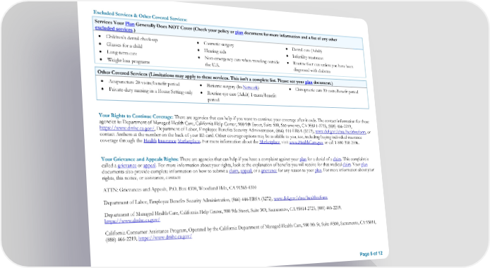 Excluded Services & Other Covered Services: Services Your Plan Generally Does NOT Cover (Check your policy or plan document for more information and a list of any other excluded services.) Children’s dental check-up Cosmetic surgery Dental care (Adult) Glasses for a child Hearing aids Infertility treatment Long-term care Non-emergency care when traveling outside Routine foot care unless you have been Weight loss programs the U.S. diagnosed with diabetes Other Covered Services (Limitations may apply to these services. This isn’t a complete list. Please see your plan document.) Acupuncture 20 visits/benefit period Bariatric surgery (In-Network) Chiropractic care 30 visits/benefit period Private-duty nursing in a Home Setting only Routine eye care (Adult) 1 exam/benefit period Your Rights to Continue Coverage: There are agencies that can help if you want to continue your coverage after it ends. The contact information for those agencies is: Department of Managed Health Care, California Help Center, 980 9th Street, Suite 500, Sacramento, CA 95814-2725, (888) 466-2219, https://www.dmhc.ca.gov/, Department of Labor, Employee Benefits Security Administration, (866) 444-EBSA (3272), www.dol.gov/ebsa/healthreform, or contact Anthem at the number on the back of your ID card. Other coverage options may be available to you, too, including buying individual insurance coverage through the Health Insurance Marketplace. For more information about the Marketplace, visit www.HealthCare.gov or call 1-800-318-2596. Your Grievance and Appeals Rights: There are agencies that can help if you have a complaint against your plan for a denial of a claim. This complaint is called a grievance or appeal. For more information about your rights, look at the explanation of benefits you will receive for that medical claim. Your plan documents also provide complete information on how to submit a claim, appeal, or a grievance for any reason to your plan. For more information about your rights, this notice, or assistance, contact: ATTN: Grievances and Appeals, P.O. Box 4310, Woodland Hills, CA 91365-4310 Department of Labor, Employee Benefits Security Administration, (866) 444-EBSA (3272), www.dol.gov/ebsa/healthreform Department of Managed Health Care, California Help Center, 980 9th Street, Suite 500, Sacramento, CA 95814-2725, (888) 466-2219, https://www.dmhc.ca.gov/ California Consumer Assistance Program, Operated by the California Department of Managed Health Care, 980 9th St, Suite #500, Sacramento, CA 95814, (888) 466-2219, https://www.dmhc.ca.gov/ Page 5 of 12
