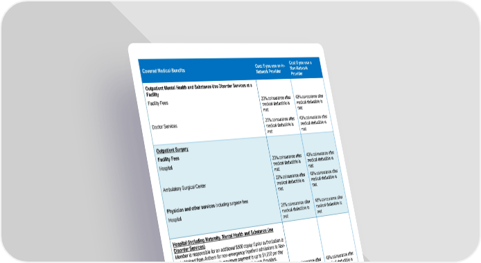 Cost if you use an In- Cost if you use a Covered Medical Benefits Network Provider Non-Network Provider Outpatient Mental Health and Substance Use Disorder Services at a Facility Facility Fees 20% coinsurance after 40% coinsurance after medical deductible is medical deductible is met met Doctor Services 20% coinsurance after 40% coinsurance after medical deductible is medical deductible is met met Outpatient Surgery Facility Fees Hospital 20% coinsurance after 40% coinsurance after medical deductible is medical deductible is met met Ambulatory Surgical Center 20% coinsurance after 40% coinsurance after medical deductible is medical deductible is met met Physician and other services including surgeon fees Hospital 20% coinsurance after 40% coinsurance after medical deductible is medical deductible is met met Hospital (Including Maternity, Mental Health and Substance Use Disorder Services) Member is responsible for an additional $500 copay if prior authorization is not obtained from Anthem for non-emergency Inpatient admissions to Non- Network Providers. Anthem’s maximum payment is up to $1,000 per day for non-emergency Inpatient admissions to Non-Network Providers. Facility Fees 20% coinsurance after 40% coinsurance after medical deductible is medical deductible is met met Physician and other services including surgeon fees 20% coinsurance after 40% coinsurance after medical deductible is medical deductible is met met Home Health Care 20% coinsurance after 40% coinsurance after Coverage is limited to 100 visits per benefit period. medical deductible is medical deductible is met met Rehabilitation and Habilitation services including physical, occupational and speech therapies. Page 4 of 10