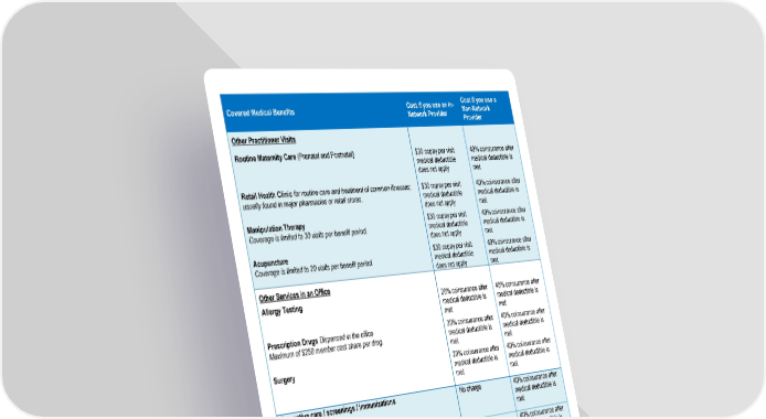 Cost if you use an In- Cost if you use a Covered Medical Benefits Network Provider Non-Network Provider Other Practitioner Visits Routine Maternity Care (Prenatal and Postnatal) $30 copay per visit 40% coinsurance after medical deductible medical deductible is does not apply met Retail Health Clinic for routine care and treatment of common illnesses; $30 copay per visit 40% coinsurance after usually found in major pharmacies or retail stores. medical deductible medical deductible is does not apply met Manipulation Therapy $30 copay per visit 40% coinsurance after Coverage is limited to 30 visits per benefit period. medical deductible medical deductible is does not apply met Acupuncture $30 copay per visit 40% coinsurance after Coverage is limited to 20 visits per benefit period. medical deductible medical deductible is does not apply met Other Services in an Office Allergy Testing 20% coinsurance after 40% coinsurance after medical deductible is medical deductible is met met Prescription Drugs Dispensed in the office 30% coinsurance after 40% coinsurance after Maximum of $250 member cost share per drug. medical deductible is medical deductible is met met Surgery 20% coinsurance after 40% coinsurance after medical deductible is medical deductible is met met Preventive care / screenings / immunizations No charge 40% coinsurance after medical deductible is met Preventive Care for Chronic Conditions per IRS guidelines No charge 40% coinsurance after medical deductible is met Diagnostic Services Lab Office 20% coinsurance after 40% coinsurance after medical deductible is medical deductible is met met Freestanding Lab 20% coinsurance after 40% coinsurance after medical deductible is medical deductible is met met Outpatient Hospital 20% coinsurance after 40% coinsurance after medical deductible is medical deductible is met met Page 2 of 10