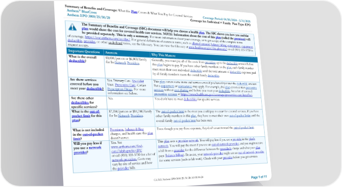 https://www.dmhc.ca.gov/, Department of Labor, Employee Benefits Security Administration, (866) 444-EBSA (3272), www.dol.gov/ebsa/healthreform, or contact Anthem at the number on the back of your ID card. Other coverage options may be available to you, too, including buying individual insurance coverage through the Health Insurance Marketplace. For more information about the Marketplace, visit www.HealthCare.gov or call 1-800-318-2596. Your Grievance and Appeals Rights: There are agencies that can help if you have a complaint against your plan for a denial of a claim. This complaint is called a grievance or appeal. For more information about your rights, look at the explanation of benefits you will receive for that medical claim. Your plan documents also provide complete information on how to submit a claim, appeal, or a grievance for any reason to your plan. For more information about your rights, this notice, or assistance, contact: ATTN: Grievances and Appeals, P.O. Box 4310, Woodland Hills, CA 91365-4310 Department of Labor, Employee Benefits Security Administration, (866) 444-EBSA (3272), www.dol.gov/ebsa/healthreform Department of Managed Health Care, California Help Center, 980 9th Street, Suite 500, Sacramento, CA 95814-2725, (888) 466-2219, https://www.dmhc.ca.gov/ California Consumer Assistance Program, Operated by the California Department of Managed Health Care, 980 9th St, Suite #500, Sacramento, CA 95814, (888) 466-2219, https://www.dmhc.ca.gov/ Does this plan provide Minimum Essential Coverage? Yes. Minimum Essential Coverage generally includes plans, health insurance available through the Marketplace or other individual market policies, Medicare, Medicaid, CHIP, TRICARE, and certain other coverage. If you are eligible for certain types of Minimum Essential Coverage, you may not be eligible for the premium tax credit. Does this plan meet the Minimum Value Standards? Yes. If your plan doesn’t meet the Minimum Value Standards, you may be eligible for a premium tax credit to help you pay for a plan through the Marketplace. To see examples of how this plan might cover costs for a sample medical situation, see the next section. Page 5 of 11