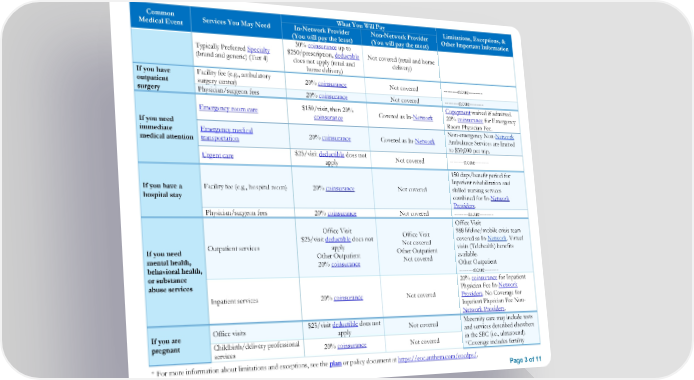 Common What You Will Pay Limitations, Exceptions, & Medical Event Services You May Need In-Network Provider Non-Network Provider Other Important Information (You will pay the least) (You will pay the most) 30% coinsurance up to Typically Preferred Specialty $250/prescription, deductible Not covered (retail and home (brand and generic) (Tier 4) does not apply (retail and delivery) home delivery) If you have Facility fee (e.g., ambulatory 20% coinsurance Not covered --------none-------- outpatient surgery center) surgery Physician/surgeon fees 20% coinsurance Not covered --------none-------- $150/visit, then 20% Copayment waived if admitted. Emergency room care coinsurance Covered as In-Network 20% coinsurance for Emergency If you need Room Physician Fee. immediate Emergency medical Non-emergency Non-Network medical attention transportation 20% coinsurance Covered as In-Network Ambulance Services are limited to $50,000 per trip. Urgent care $25/visit deductible does not Not covered --------none-------- apply 150 days/benefit period for Inpatient rehabilitation and If you have a Facility fee (e.g., hospital room) 20% coinsurance Not covered skilled nursing services hospital stay combined for In-Network Providers. Physician/surgeon fees 20% coinsurance Not covered --------none-------- Office Visit Office Visit Office Visit 988 lifeline/mobile crisis team $25/visit deductible does not Not covered covered as In-Network. Virtual If you need Outpatient services apply Other Outpatient visits (Telehealth) benefits mental health, Other Outpatient Not covered available. behavioral health, 20% coinsurance Other Outpatient or substance --------none-------- abuse services 20% coinsurance for Inpatient Physician Fee In-Network Inpatient services 20% coinsurance Not covered Providers. No Coverage for Inpatient Physician Fee Non- Network Providers. Office visits $25/visit deductible does not Not covered Maternity care may include tests If you are apply and services described elsewhere pregnant Childbirth/delivery professional 20% coinsurance Not covered in the SBC (i.e., ultrasound). services *Coverage includes fertility * For more information about limitations and exceptions, see the plan or policy document at https://eoc.anthem.com/eocdps/. Page 3 of 11