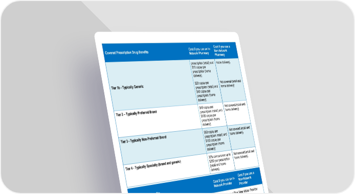 Cost if you use an In- Cost if you use a Covered Prescription Drug Benefits Network Pharmacy Non-Network Pharmacy prescription (retail) and home delivery) $10 copay per prescription (home delivery) Tier 1b - Typically Generic $20 copay per Not covered (retail and prescription (retail) and home delivery) $40 copay per prescription (home delivery) Tier 2 – Typically Preferred Brand $40 copay per Not covered (retail and prescription (retail) and home delivery) $100 copay per prescription (home delivery) Tier 3 - Typically Non-Preferred Brand $60 copay per Not covered (retail and prescription (retail) and home delivery) $150 copay per prescription (home delivery) Tier 4 - Typically Specialty (brand and generic) 30% coinsurance up to Not covered (retail and $250 per prescription home delivery) (retail and home delivery) Cost if you use an In- Cost if you use a Covered Vision Benefits Network Provider Non-Network Provider This is a brief outline of your vision coverage. To receive the In-Network benefit, you must use a Blue View Vision Provider. Only children's vision services count towards your out-of-pocket limit. Children’s Vision exam (up to age 19) No charge Not covered Limited to 1 exam per benefit period. Adult Vision exam (age 19 and older) No charge Not covered Limited to 1 exam per benefit period. Notes: • If you have an office visit with your Primary Care Physician, Specialist or Urgent Care at an Outpatient Facility (e.g., Hospital or Ambulatory Surgical Facility), benefits for Covered Services will be paid under “Outpatient Facility Services”. • Costs may vary by the site of service. Other cost shares may apply depending on services provided. Check your Certificate of Coverage for details. Page 5 of 9