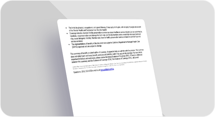 • The limits for physical, occupational, and speech therapy, if any apply to this plan, will not apply if you get care as part of the Mental Health and Substance Use Disorder benefit. • Coverage includes standard fertility preservation services as a basic healthcare service including but are not limited to, injections, cryopreservation and storage for both male and female members when a medically necessary treatment may cause iatrogenic infertility. Member cost share for fertility preservation services is based on provider type and service rendered. • The representations of benefits in this document are subject to California Department of Managed Health Care (DMHC) approval and are subject to change. This summary of benefits is a brief outline of coverage, designed to help you with the selection process. This summary does not reflect each and every benefit, exclusion and limitation which may apply to the coverage. For more details, important limitations and exclusions, please review the formal Evidence of Coverage (EOC). If there is a difference between this summary and the Evidence of Coverage (EOC), the Evidence of Coverage (EOC), will prevail. Anthem Blue Cross is the trade name of Blue Cross of California. Independent licensee of the Blue Cross Association. ® ANTHEM is a registered trademark of Anthem Insurance Companies, Inc. The Blue Cross name and symbol are registered marks of the Blue Cross Association. Questions: (855) 333-5730 or visit us at www.anthem.com/ca Page 6 of 9