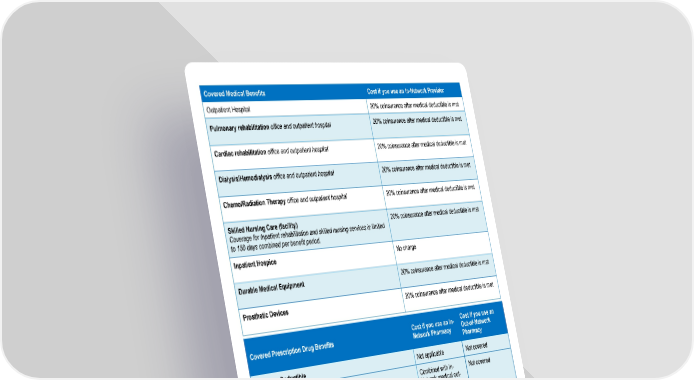 Covered Medical Benefits Cost if you use an In-Network Provider Outpatient Hospital 20% coinsurance after medical deductible is met Pulmonary rehabilitation office and outpatient hospital 20% coinsurance after medical deductible is met Cardiac rehabilitation office and outpatient hospital 20% coinsurance after medical deductible is met Dialysis/Hemodialysis office and outpatient hospital 20% coinsurance after medical deductible is met Chemo/Radiation Therapy office and outpatient hospital 20% coinsurance after medical deductible is met Skilled Nursing Care (facility) 20% coinsurance after medical deductible is met Coverage for Inpatient rehabilitation and skilled nursing services is limited to 150 days combined per benefit period. Inpatient Hospice No charge Durable Medical Equipment 20% coinsurance after medical deductible is met Prosthetic Devices 20% coinsurance after medical deductible is met Cost if you use an In- Cost if you use an Covered Prescription Drug Benefits Network Pharmacy Out-of-Network Pharmacy Pharmacy Deductible Not applicable Not covered Pharmacy Out-of-Pocket Limit Combined with In- Not covered Network medical out- of-pocket limit Prescription Drug Coverage Network: Base Network Drug List: CA Essential DMHC Day Supply Limits: Retail Pharmacy 30 day supply (cost shares noted below) Retail 90 Pharmacy 90 day supply (3 times the 30 day supply cost share(s) charged at In-Network Retail Pharmacies noted below applies). Home Delivery Pharmacy 90 day supply (maximum cost shares noted below). Maintenance medications are available through our home delivery pharmacy. You will need to call us on the number on your ID card to sign up when you first use the service. Specialty Pharmacy 30 day supply (cost shares noted below for retail and home delivery apply). We may require certain drugs with special handling, provider coordination or patient education be filled by our designated specialty pharmacy. Tier 1a - Typically Lower Cost Generic $5 copay per Not covered (retail and Page 4 of 9