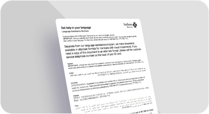 Get help in your language Language Assistance Services Curious to know what all this says? We would be too. Here’s the English version: IMPORTANT: Can you read this letter? If not, we can have somebody help you read it. You may also be able to get this letter written in your language. For free help, please call right away at 1-888-254-2721. (TTY/TDD: 711) Separate from our language assistance program, we make documents available in alternate formats for members with visual impairments. If you need a copy of this document in an alternate format, please call the customer service telephone number on the back of your ID card. Spanish IMPORTANTE: ¿Puede leer esta carta? De lo contrario, podemos hacer que alguien lo ayude a leerla. También puede recibir esta carta escrita en su idioma. Para obtener ayuda gratuita, llame de inmediato al 1-888-254-2721. (TTY/TDD: 711) Arabic Armenian ՈՒՇԱԴՐՈՒԹՅՈՒՆ. Կարողանո՞ւմ եք ընթերցել այս նամակը: Եթե ոչ, մենք կարող ենք տրամադրել ինչ-որ մեկին, ով կօգնի Ձեզ՝ կարդալ այն: Կարող ենք նաև այս նամակը Ձեզ գրավոր տարբերակով տրամադրել: Անվճար օգնություն ստանալու համար կարող եք անհապաղ զանգահարել 1-888-254-2721 հեռախոսահամարով: (TTY/TDD: 711) Chinese 重要事項:您能看懂這封信函嗎?如果您看不懂,我們能夠找人協助您。您有可能可以獲得以您的語言而寫的本信函。如需免 費協助,請立即撥打1-888-254-2721。(TTY/TDD: 711) Farsi Hindi Hmong TSEEM CEEB: Koj puas muaj peev xwm nyeem tau daim ntawv no? Yog hais tias koj nyeem tsis tau, peb muaj peev xwm cia lwm tus pab nyeem rau koj mloog. Tsis tas li ntawd tej zaum koj kuj tseem yuav tau txais daim ntawv no sau ua koj hom lus thiab. Txog rau kev pab dawb, thov hu tam sim no rau tus xov tooj 1-888-254-2721. (TTY/TDD: 711) Japanese Anthem Blue Cross is the trade name of Blue Cross of California. Independent licensee of the Blue Cross Association. ANTHEM is a registered trademark of Anthem Insurance Companies, Inc. The Blue Cross name and symbol are registered marks of the Blue Cross Association. MCASH4644CML 06/16 DMHC3 DMHCW #CA-DMHC-001# Page 9 of 10