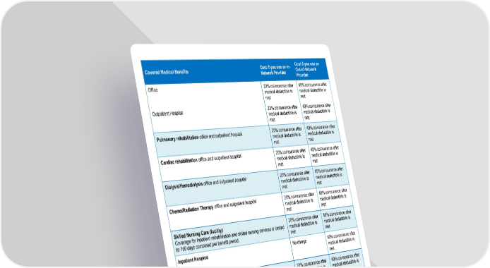 Cost if you use an In- Cost if you use an Covered Medical Benefits Network Provider Out-of-Network Provider Office 20% coinsurance after 40% coinsurance after medical deductible is medical deductible is met met Outpatient Hospital 20% coinsurance after 40% coinsurance after medical deductible is medical deductible is met met Pulmonary rehabilitation office and outpatient hospital 20% coinsurance after 40% coinsurance after medical deductible is medical deductible is met met Cardiac rehabilitation office and outpatient hospital 20% coinsurance after 40% coinsurance after medical deductible is medical deductible is met met Dialysis/Hemodialysis office and outpatient hospital 20% coinsurance after 40% coinsurance after medical deductible is medical deductible is met met Chemo/Radiation Therapy office and outpatient hospital 20% coinsurance after 40% coinsurance after medical deductible is medical deductible is met met Skilled Nursing Care (facility) 20% coinsurance after 40% coinsurance after Coverage for Inpatient rehabilitation and skilled nursing services is limited medical deductible is medical deductible is to 150 days combined per benefit period. met met Inpatient Hospice No charge 40% coinsurance after medical deductible is met Durable Medical Equipment 20% coinsurance after 40% coinsurance after medical deductible is medical deductible is met met Prosthetic Devices 20% coinsurance after 40% coinsurance after medical deductible is medical deductible is met met Cost if you use an In- Cost if you use an Covered Prescription Drug Benefits Network Pharmacy Out-of-Network Pharmacy Pharmacy Deductible Not applicable Not applicable Pharmacy Out-of-Pocket Limit Combined with In- Combined with Out-of- Network medical out- Network medical out- Page 5 of 10