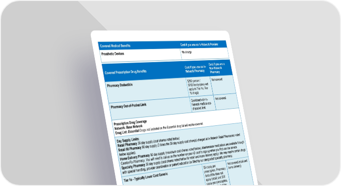 Covered Medical Benefits Cost if you use an In-Network Provider Prosthetic Devices No charge Cost if you use an In- Cost if you use a Covered Prescription Drug Benefits Network Pharmacy Non-Network Pharmacy Pharmacy Deductible $250 person / Not covered $750 family (does not apply to Tier 1a, Tier 1b drugs) Pharmacy Out-of-Pocket Limit Combined with In- Not covered Network medical out- of-pocket limit Prescription Drug Coverage Network: Base Network Drug List: Essential Drugs not included on the Essential drug list will not be covered. Day Supply Limits: Retail Pharmacy 30 day supply (cost shares noted below) Retail 90 Pharmacy 90 day supply (3 times the 30 day supply cost share(s) charged at In-Network Retail Pharmacies noted below applies). Home Delivery Pharmacy 90 day supply (maximum cost shares noted below). Maintenance medications are available through CarelonRx Pharmacy. You will need to call us on the number on your ID card to sign up when you first use the service. Specialty Pharmacy 30 day supply (cost shares noted below for retail and home delivery apply). We may require certain drugs with special handling, provider coordination or patient education be filled by our designated specialty pharmacy. Tier 1a - Typically Lower Cost Generic $5 copay per Not covered (retail and prescription, Pharmacy home delivery) deductible does not apply (retail) and $10 copay per prescription, Pharmacy deductible does not apply (home delivery) Tier 1b - Typically Generic $20 copay per Not covered (retail and prescription, Pharmacy home delivery) deductible does not apply (retail) and $40 copay per prescription, Pharmacy deductible does not apply (home delivery) Tier 2 – Typically Preferred Brand $50 copay per Not covered (retail and prescription after home delivery) Pharmacy deductible is met (retail) and $125 Page 5 of 10
