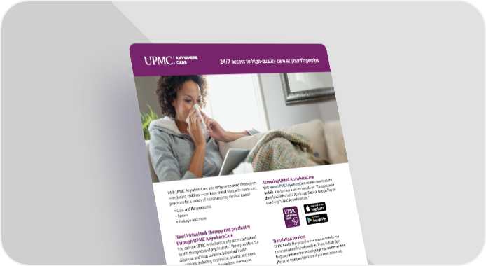 24/7 access to high-quality care at your 昀椀ngertips With UPMC AnywhereCare, you and your covered dependents Accessing UPMC AnywhereCare 1 —including children —can have virtual visits with health care Visit www.UPMCAnywhereCare.com or download the 2 providers for a variety of nonemergency medical issues: mobile app to have a secure virtual visit. The app can be • Cold and flu symptoms downloaded from the Apple App Store or Google Play by • Rashes searching “UPMC AnywhereCare.” • Pink eye and more New! Virtual talk therapy and psychiatry through UPMC AnywhereCare You can use UPMC AnywhereCare to access behavioral 3 health therapists and psychiatrists. These providers can Translation services diagnose and treat common behavioral health UPMC Health Plan provides free services to help you conditions, including depression, anxiety, and stress communicate effectively with us. These include sign management. They can also perform medication language interpreters and language translation services. evaluations and conduct ongoing medication Please let your provider know if you need assistance. management. You will be assisted within UPMC AnywhereCare by Behavioral Health Concierges who will verify your eligibility, connect you to the appropriate Ask a Pharmacist feature therapists and psychiatrists, and help schedule You can schedule a video call with one of our licensed appointments. pharmacists through UPMC AnywhereCare’s Ask a Pharmacist feature. 1 platform. It is available to children ages 0 to 17. UPMC Children’s AnywhereCare is available only to UPMC Children’s AnywhereCare is a service that is offered through the UPMC AnywhereCare patients who are in Pennsylvania. In order for a child to have a UPMC Children’s AnywhereCare visit, the child’s parent or legal guardian must be with the child during the video portion of the visit, and the child and parent or legal guardian must be in Pennsylvania during the visit. If you are located outside of Pennsylvania at the time of service, you may select the standard UPMC AnywhereCare module and you will receive care from a provider employed or contracted by Online Care Network II P.C. (OCN) at the discretion of the provider. OCN is not an affiliate of UPMC. 2 UPMC-employed provider or a provider from Online Care Network II P.C. (OCN), subject to availability. UPMC Health Plan members located in Pennsylvania at the time of virtual visit may select a Members located outside of Pennsylvania will receive service from OCN. OCN is not an affiliate of UPMC. Limitations may apply for members of ASO plans who have opted out of coverage. 3Eligible members using virtual talk therapy and psychiatry through UPMC AnywhereCare will receive care from therapists and psychiatrists employed or contracted by Online Care Network II PC (OCN), also known as Amwell Medical Group. OCN is not an affiliate of UPMC. Copyright 2020 UPMC Health Plan Inc. All rights reserved. AWC FLIER 20CG1562048 (DC) 11/25/20 500 SS REPRINT 6/9/21 10M KP