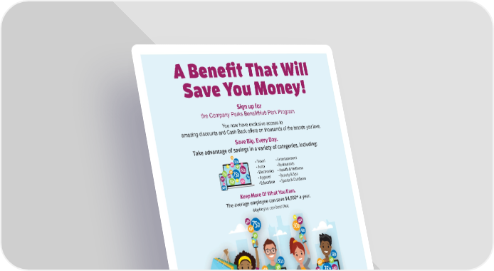 The flyer promotes the Company Perks BenefitHub Perk Program, highlighting exclusive savings and cashback offers across various categories, with potential annual savings of $4,900 for employees.