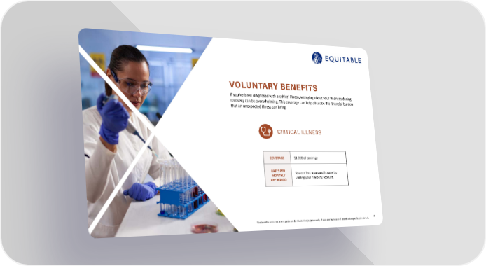 15 The benefits and rates in this guide are for illustrative purposes only. Please see Summary of Benefits for specific plan details. VOLUNTARY BENEFITS If you’ve been diagnosed with a critical illness, worrying about your finances during recovery can be overwhelming. This coverage can help alleviate the financial burden that an unexpected illness can bring. CRITICAL ILLNESS COVERAGE $1,000 of coverage RATES PER MONTHLY PAY PERIOD You can find your specific rates by visiting your Paylocity account.