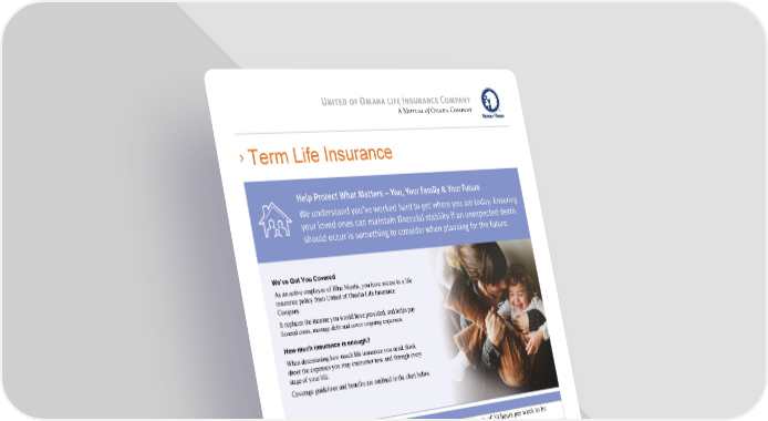 Who is eligible for this insurance? You must be actively working (performing all normal duties of your job) at least 30 hours per week. What is Guarantee Issue? The amount of insurance applied for without answering any health questions (or which does not require evidence of insurability). Coverage amounts over the Guarantee Issue Amount will require evidence of insurability. What is Evidence of Insurability? Evidence of Insurability or proof of good health – may be required if you are a late entrant and/or you request any additional coverage above your guarantee issue amount. Can I take this insurance with me if I change jobs/am no longer a member of this group? In the event this insurance ends due to a change in your employment/membership status with the group, or for certain other reasons, you may have the right to continue this insurance under the Conversion provision, subject to certain conditions. Are there any limitations, reductions or exclusions? The benefits payable are based on the following: · Insurance benefits and guarantee issue amounts are subject to age reductions: - At age 65, amounts reduce to 65% - At age 70, amounts reduce to 50% · Information about the AD&D exclusions for this plan will be included in the summary of coverage, which you will receive after enrolling. All exclusions may not be applicable, or may be adjusted, as required by state regulations. This information describes some of the features of the benefits plan. Benefits may not be available in all states. Please refer to the certificate booklet for a full explanation of the plan's benefits, exclusions, limitations and reductions. Should there be any discrepancy between the certificate booklet and this outline, the certificate booklet will prevail. Life insurance and accidental death & dismemberment insurance are underwritten by United of Omaha Life Insurance Company, 3300 Mutual of Omaha Plaza, Omaha, NE 68175. Policy form number 7000GM-U-EZ 2010 or state equivalent (in NC: 7000GM-U-EZ 2010 NC). United of Omaha Life Insurance Company is licensed nationwide, except New York. TERM LIFE INSURANCE