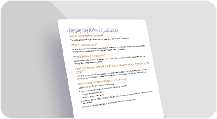 Who is eligible for this insurance? You must be actively working (performing all normal duties of your job) at least 30 hours per week. What is Guarantee Issue? The amount of insurance applied for without answering any health questions (or which does not require evidence of insurability). Coverage amounts over the Guarantee Issue Amount will require evidence of insurability. What is Evidence of Insurability? Evidence of Insurability or proof of good health – may be required if you are a late entrant and/or you request any additional coverage above your guarantee issue amount. Can I take this insurance with me if I change jobs/am no longer a member of this group? In the event this insurance ends due to a change in your employment/membership status with the group, or for certain other reasons, you may have the right to continue this insurance under the Conversion provision, subject to certain conditions. Are there any limitations, reductions or exclusions? The benefits payable are based on the following: · Insurance benefits and guarantee issue amounts are subject to age reductions: - At age 65, amounts reduce to 65% - At age 70, amounts reduce to 50% · Information about the AD&D exclusions for this plan will be included in the summary of coverage, which you will receive after enrolling. All exclusions may not be applicable, or may be adjusted, as required by state regulations. This information describes some of the features of the benefits plan. Benefits may not be available in all states. Please refer to the certificate booklet for a full explanation of the plan's benefits, exclusions, limitations and reductions. Should there be any discrepancy between the certificate booklet and this outline, the certificate booklet will prevail. Life insurance and accidental death & dismemberment insurance are underwritten by United of Omaha Life Insurance Company, 3300 Mutual of Omaha Plaza, Omaha, NE 68175. Policy form number 7000GM-U-EZ 2010 or state equivalent (in NC: 7000GM-U-EZ 2010 NC). United of Omaha Life Insurance Company is licensed nationwide, except New York. TERM LIFE INSURANCE