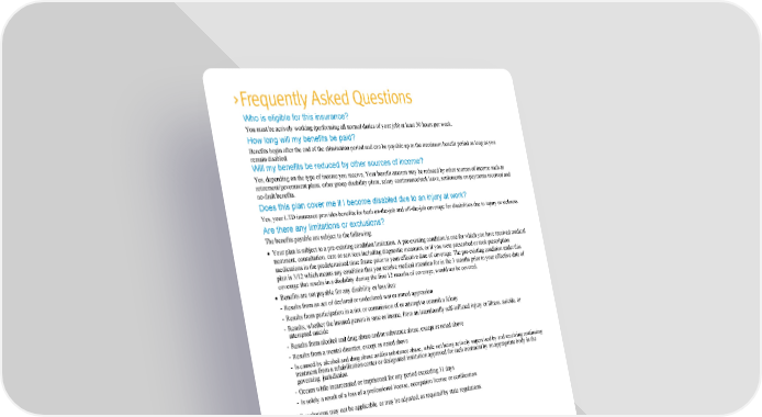 Who is eligible for this insurance? You must be actively working (performing all normal duties of your job) at least 30 hours per week. How long will my benefits be paid? Benefits begin after the end of the elimination period and can be payable up to the maximum benefit period as long as you remain disabled. Will my benefits be reduced by other sources of income? Yes, depending on the type of income you receive. Your benefit amount may be reduced by other sources of income such as retirement/government plans, other group disability plans, salary continuance/sick leave, settlements on payments received and no-fault benefits. Does this plan cover me if I become disabled due to an injury at work? Yes, your LTD insurance provides benefits for both on-the-job and off-the-job coverage for disabilities due to injury or sickness. Are there any limitations or exclusions? The benefits payable are subject to the following: · Your plan is subject to a pre-existing condition limitation. A pre-existing condition is one for which you have received medical treatment, consultation, care or services including diagnostic measures, or if you were prescribed or took prescription medications in the predetermined time frame prior to your effective date of coverage. The pre-existing condition under this plan is 3/12 which means any condition that you receive medical attention for in the 3 months prior to your effective date of coverage that results in a disability during the first 12 months of coverage, would not be covered. · Benefits are not payable for any disability or loss that: - Results from an act of declared or undeclared war or armed aggression - Results from participation in a riot or commission of or attempt to commit a felony - Results, whether the insured person is sane or insane, from an intentionally self-inflicted injury or illness, suicide, or attempted suicide - Results from alcohol and drug abuse and/or substance abuse, except as noted above - Results from a mental disorder, except as noted above - Is caused by alcohol and drug abuse and/or substance abuse, while not being actively supervised by and receiving continuing treatment from a rehabilitation center or designated institution approved for such treatment by an appropriate body in the governing jurisdiction - Occurs while incarcerated or imprisoned for any period exceeding 31 days - Is solely a result of a loss of a professional license, occupation license or certification All exclusions may not be applicable, or may be adjusted, as required by state regulations. This information describes some of the features of the benefits plan. Benefits may not be available in all states. Please refer to the certificate booklet for a full explanation of the plan’s benefits, exclusions, limitations and reductions. Should there be any discrepancy between the certificate booklet and this summary, the certificate booklet will prevail. Benefits availability is subject to final acceptance and approval of the group application by the underwriting company. Disability income insurance is underwritten by United of Omaha Life Insurance Company, 3300 Mutual of Omaha Plaza, Omaha, NE 68175, 1-800-769-7159. United of Omaha Life Insurance Company is licensed nationwide, except in New York. Policy form number 7000GM-U-EZ-2010. LONG-TERM DISABILITY INSURANCE