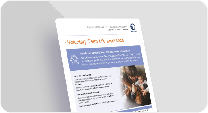 Who is eligible for this insurance? · You must be actively working (performing all normal duties of your job) at least 30 hours per week. · Your dependent(s) must be performing normal activities and not be confined (at home or in a hospital/care facility) and any child(ren) must be under age 26. What is Guarantee Issue? The amount of insurance applied for without answering any health questions (or which does not require evidence of insurability). Coverage amounts over the Guarantee Issue Amount will require evidence of insurability. What is Evidence of Insurability? Evidence of Insurability or proof of good health – may be required if you are a late entrant and/or you request any additional coverage above your guarantee issue amount. Can I take this insurance with me if I change jobs/am no longer a member of this group? In the event this insurance ends due to a change in your employment/membership status with the group, or for certain other reasons, you or your insured spouse may have the right to continue this insurance under the Portability or Conversion provision, subject to certain conditions. Are there any limitations, reductions or exclusions? The benefits payable are based on the following: · Insurance benefits and guarantee issue amounts are subject to age reductions: - At age 65, amounts reduce to 65% - At age 70, amounts reduce to 50% · Spouse coverage terminates when you reach age 70. · Life insurance benefits will not be paid if the insured’s death is the result of suicide within two years from the date coverage begins. If this occurs, the sum of the premiums paid will be returned to the beneficiary. The same applies for any future increases in coverage under this plan. All exclusions may not be applicable, or may be adjusted, as required by state regulations. This information describes some of the features of the benefits plan. Benefits may not be available in all states. Please refer to the certificate booklet for a full explanation of the plan's benefits, exclusions, limitations and reductions. Should there be any discrepancy between the certificate booklet and this outline, the certificate booklet will prevail. Availability of benefits is subject to final acceptance and approval of the group application by the underwriting company. Life insurance is underwritten by United of Omaha Life Insurance Company, 3300 Mutual of Omaha Plaza, Omaha, NE 68175. Policy form number 7000GM-U-EZ 2010 or state equivalent (in NC: 7000GM-U-EZ 2010 NC). United of Omaha Life Insurance Company is licensed nationwide, except New York. VOLUNTARY TERM LIFE INSURANCE