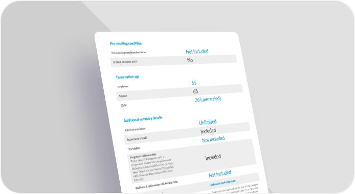Pre-existing condition Pre-existing condition limitation Not included Is this a takeover plan? No Termination age Employee 65 Spouse 65 Child 26 (unmarried) Additional summary details Lifetime maximum Unlimited Recurrence benefit Included Portability Not included Progressive disease rider Pays a benefit if diagnosed with a progressive disease including Advanced Alzheimer's, Advanced Parkinson's, Major Included Head Trauma, Motor Neuron Disease (i.e. ALS), Muscular Dystrophy and Multiple Sclerosis. Wellness & optional genetic testing rider Not included Eligibility waiting period Defined by the Policyholder Employees have 31 days from the plan effective date or their eligibility date, whichever is later, to enroll or they are considered a late entrant. Late entrants must wait Annual enrollment and late entrant rules until the next annual enrollment to enroll in the plan. These rules apply to both employee and dependent options. BEAM SUPPORT LEARN MORE [email protected] | (800) 648 1179 beambenefits.com BM-SOB-0040-202306 2 of 3