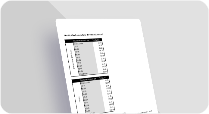 Monthly 4-Tier Premium Rates--Uni-Tobacco (Continued) Employee Attained Age Per $1,000 24 and Under $0.51 25-29 $0.58 ) 30-34 $0.63 (ren 35-39 $0.75 ild 40-44 $0.96 45-49 $1.38 50-54 $1.84 oyee + Ch55-59 $2.44 l 60-64 $3.35 Emp 65-69 $4.52 70-74 $6.02 75 and Over $7.97 Employee Attained Age Per $1,000 24 and Under $0.73 25-29 $0.84 30-34 $0.91 35-39 $1.09 40-44 $1.42 ily 45-49 $2.07 Fam 50-54 $2.78 55-59 $3.72 60-64 $5.14 65-69 $6.93 70-74 $9.22 75 and Over $12.18 Rates include Health Screening benefit for Employee, Spouse, and Child. To Calculate: Weekly=Monthly cost x 12 ÷52; Bi-Weekly =Monthly cost x 12÷26; Semi-Monthly=Monthly cost x 12 ÷24 Critical Illness insurance policies are designed to provide benefits at a preselected, fixed-dollar amount, for specific critical illness conditions. Coverage may be subject to exclusions, limitations, reductions, and termination of benefit provisions. The policies do not satisfy the minimum essential coverage requirements of the Affordable Care Act. Critical Illness policies are insured by Symetra Life Insurance Company, 777 108th Avenue NE, Suite 1200, Bellevue, WA 98004. Base policy form number is SBC-00535 in most states and is not available in all U.S. states or any U.S. territory.